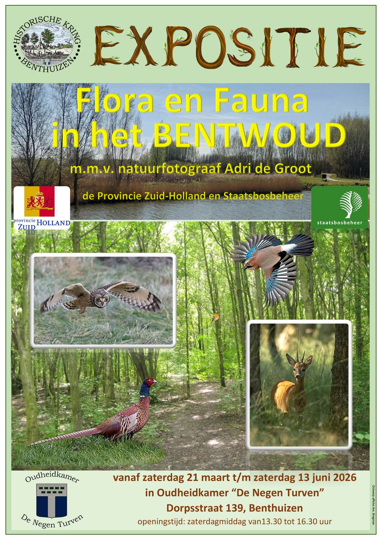 Vanaf zaterdag 21 maart is een bijzondere expositie te zien over het Bentwoud. Natuurfotograaf Adri de Groot bekent om zijn vogeldagboeken toont er een selectie van zijn natuurfoto’s. Daarnaast zijn er opgezette dieren te zien die een indruk geven van de diersoorten die in het gebied voorkomen. De expositie is tot stand gekomen met medewerking van Staatsbosbeheer en de Provincie Zuid-Holland. De tentoonstelling is te bezoeken van 21 maart tot en met 13 juni op zaterdagmiddag van 13.30 tot16.30 uur in Oudheidkamer ‘De Negen Turven’, Dorpsstraat 139 in Benthuizen. De toegang is gratis.